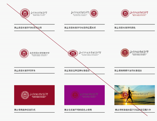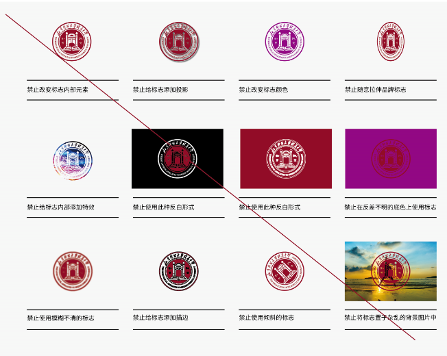 标志在应用中通常会受一些习惯行为或主观意见影响,不当地使用将影响学校对外形象的一致性,本页将容易混乱的错误列举,避免曹成标志形象传达的不良效果。
