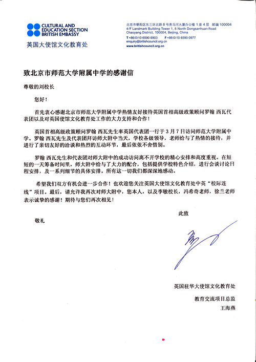 英国大使馆文化教育处致我校的感谢信