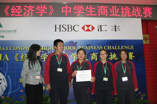 2008年12月13日,在政治组赵敏老师的带领下,我校由高一、高二共11名《企业经营模拟》选修课同学参加了由JA中国青年成就组织举办的“2008 JA《经济学》中学生商业挑战赛”,与来自十四所学校的32个小组对决。高二(1)班丁玄、高二(6)班施彦、高二(4)班金鑫、胡文谷四位同学组成的VISION队表现优异,获得第一名(The First Prize Team)。