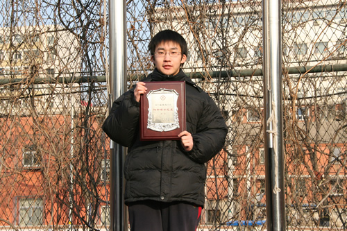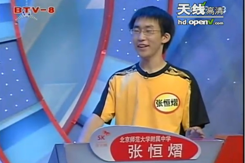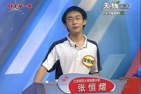张恒熠同学作为我校理科实验班学生平时爱好广泛、知识广博,多次在北京市学科竞赛、模拟联合国活动中获奖,并连年荣获校友奖学金。2008年他被选送参加北京电视台主办的面向中学生的全国性知识竞赛节目SK状元榜,以丰富的学识、灵敏的反应和沉着的应对,战胜了来自北京、上海、天津、济南、大连等多所名校的选手,连续蝉联两场擂主,最后进军年度总决赛,荣获季军。北京电视台向张恒熠同学赠送1万元奖学金和一台数码摄像机,并向学校赠送了三台台式电脑。