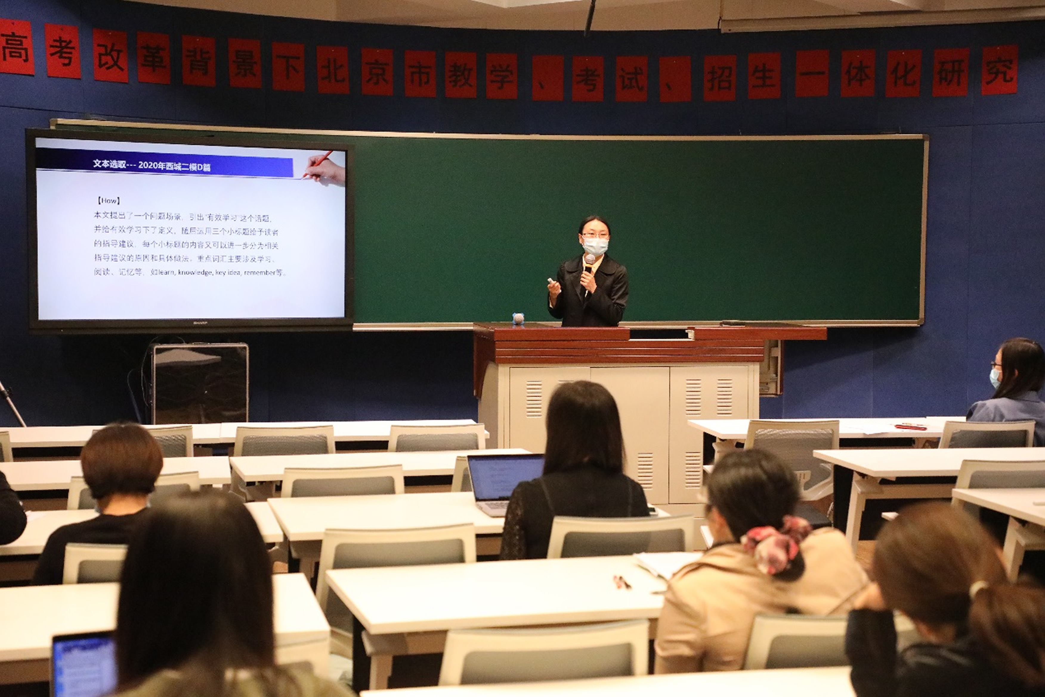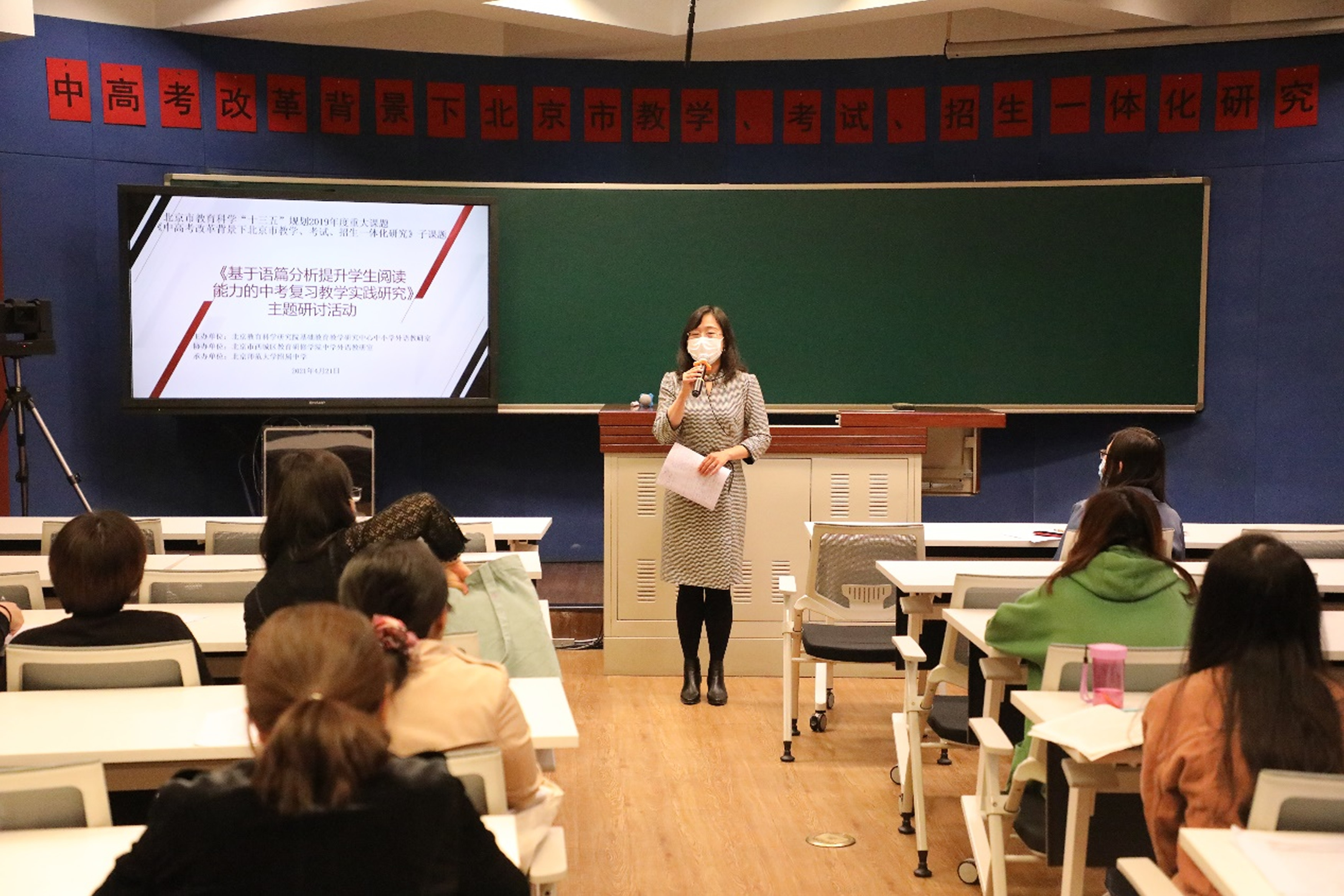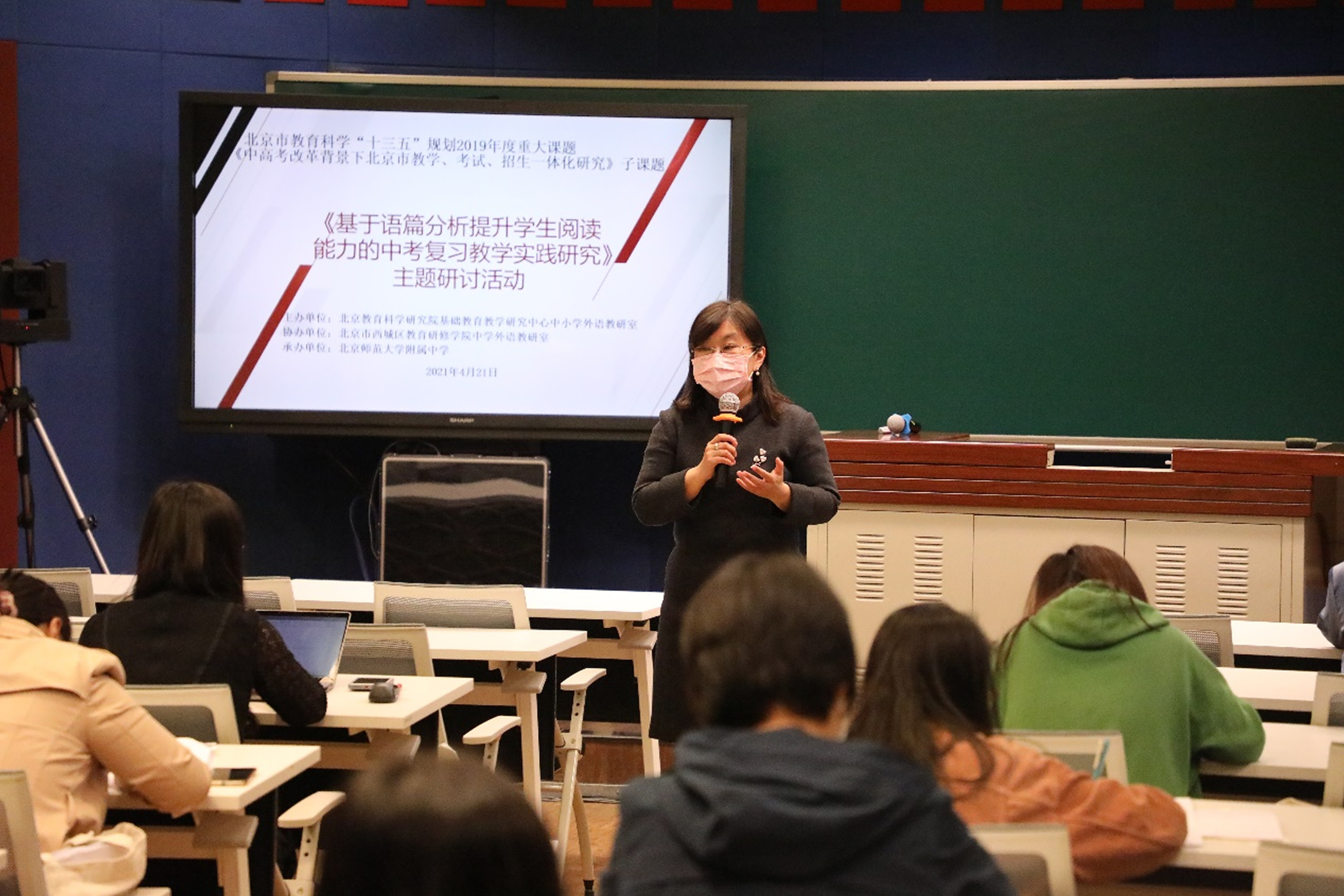 2021年4月21日,为了进一步研究提高初中英语教学的科学性和实效性,北京市基础教育教研中心外语教研室联合西城分院外语教研室,在我校举行了“基于语篇分析提升学生阅读能力的中考复习教学实践研究”主题研讨活动。本活动是北京市教育科学“十三五”规划2019年度重大课题《中高考改革背景下北京市教学考试招生一体化研究》的子课题主题研讨活动。来自北京各区的教研员及我校初三英语教师50人参加了本次活动。基教研中心英语学科教研员、中小学外语教研室主任蒋京丽,基教研中心英语学科教研员何煜,西城区教育研修学院教研员张继红、刘恒,校长助理冯健、教学处副主任张鹏出席了活动。刘蔚岚老师主持了本次活动。本次活动还采用云直播,为不能亲临会场参加研讨的老师提供了观摩和学习机会。