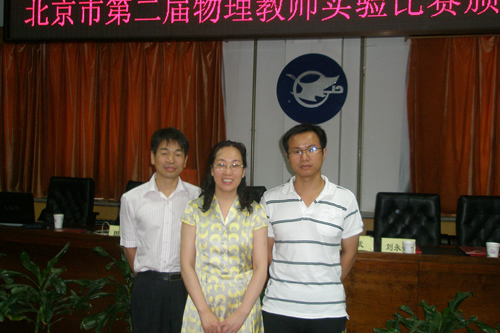 2008年我校陈赞、王青霞、王晶三位教师参加了宣武区的选拔赛,三位教师均获得区级一等奖,陈赞老师以前两名的成绩代表宣武区参加北京市比赛,参赛题目抽签得出:电容的决定因素。比赛方式是现场实验并进行讲解15分钟,然后回答评委提出的问题。陈赞老师做的实验现象非常明显,答辩思路清楚,内容准确,受到评委及观摩的教师的好评。2009年6月12日,陈赞、马桂君两位老师参加了在陈经纶中学举行了北京市第二届物理教师实验比赛的颁奖及展示活动。