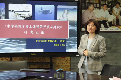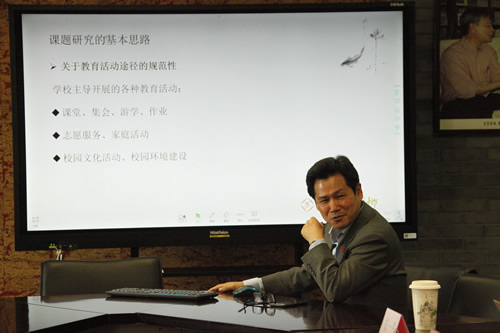 冯健校长助理首先致辞,简要介绍了附中科研的优良传统和本次活动的主要安排,并恳请专家指导我校的科研工作。接下来科研室郑一丹主任进行汇报,从对中学教科研工作的认识、学校科研工作的管理举措、重点研究项目促内涵发展和教科研活动所取得的成效四个方面阐述了附中近两年在教科研领域的探索和主要成绩。其后梁原草副校长和政治教研组长胡莹老师分别代表课题组做了关于《中学中华优秀传统文化教育活动的规范化研究》和《中学伦理学校本课程的开发与建设》的课题汇报。