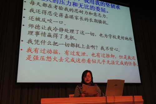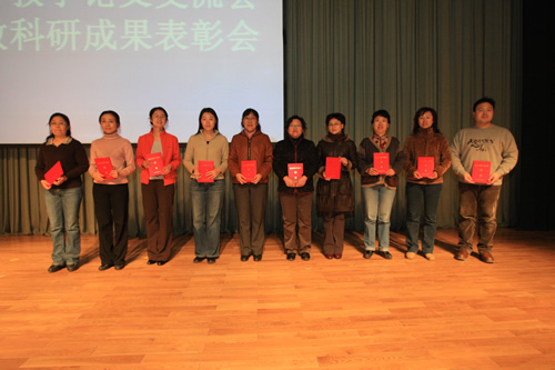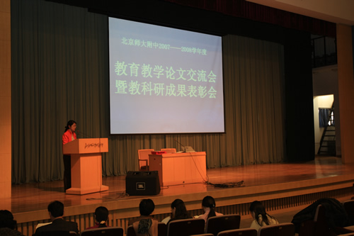 11月21日,一年一度的“教育教学论文交流暨教科研成果表彰会”在礼堂举行。大会由教学教研处主任冯健主持,会议首先公布了本年度论文评选结果,在经过评委的两轮认真筛选与评定后,此次共评出一等奖5篇,二等奖20篇,三等奖49篇,鼓励奖24篇。卢晓华、周亚、陈瑾、陈耀文四位教师代表分别从不同角度介绍了自己的论文和教科研情况。会议还公布了北京市学科带头人、骨干教师评选结果;北京市初中新课程教师教学基本功展示活动评选结果;宣武区中学第二届“实施国家基础教育课程改革试验”先进集体、先进个人成果名单;宣武区中学第四届教研组、青年教师评优活动评奖结果;2007年论文(教学案例)公开发表、获奖教师名单和各教研组辅导学生竞赛获奖情况。刘沪校长、王莉萍副校长分别做了总结性发言,充分肯定了大家的成绩,对学校的教科研工作提出了新的期望。