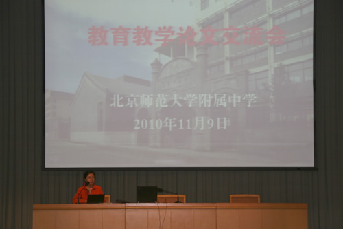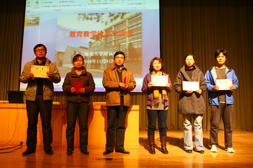 2010年11月9日,一年一度的“教育教学论文交流会”在附中百年会堂举行。大会由教学教研处主任冯健主持,会议首先公布了本年度论文评选结果,在经过学科评委的两轮认真评定及专家评委的终评后,此次共评出一等奖5篇,二等奖21篇,三等奖36篇,鼓励奖28篇。梁原草副校长宣读了获奖名单,刘沪校长亲自为获奖老师颁发证书。