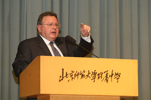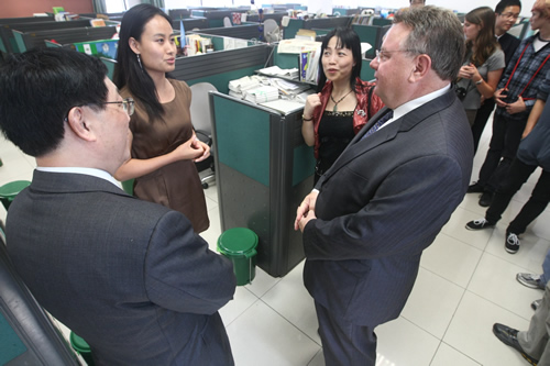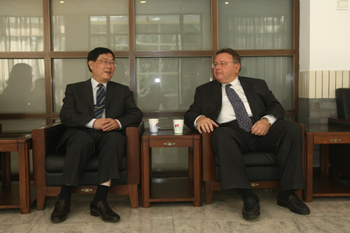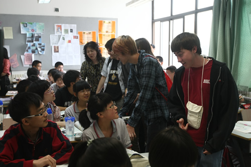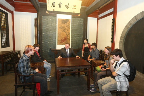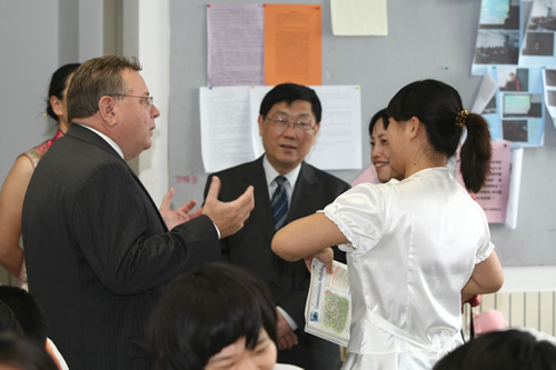 访问团一行深入课堂听课,观看了我校学生精彩的文艺演出,参观了美丽的校园,和我校师生进行了亲切交流。本杰明・富兰克林高中校长Rusnak博士为我校高一年级学生做了有关美国历史和教育的讲演,并诚挚邀请附中学子到美国学习交流。同学们听得兴趣盎然,并在提问环节和Rusnak博士进行深入互动。Rusnak校长对我校师生的高素质以及优秀的校园文化建设给予高度赞扬。