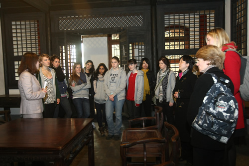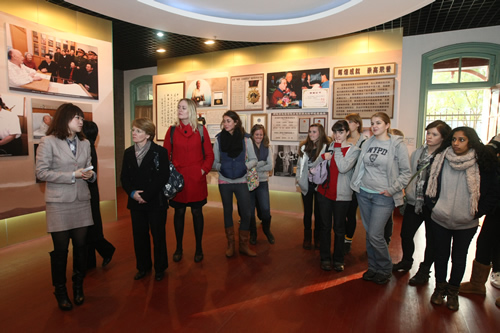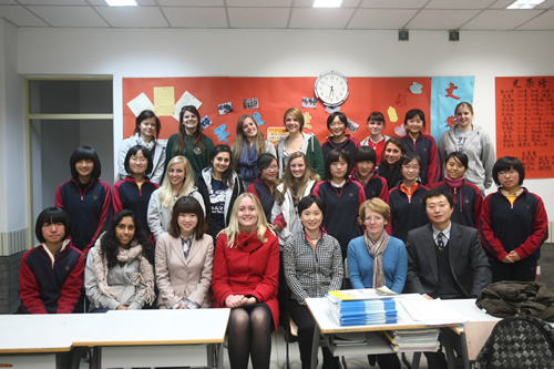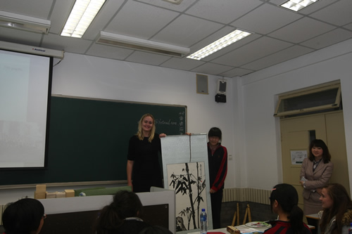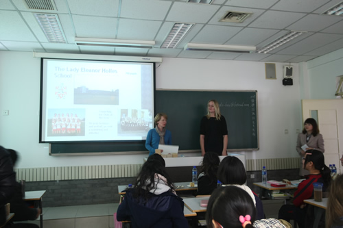 10月27日下午,英国Lady Eleanor Holles School代表团的两位老师和十一位同学到我校参观访问。代表团首先参观了杏坛、三味书屋、钱学森纪念馆,随后走进高二11班教室听了卫刚老师的历史课。卫刚老师精彩的讲授以及刘畅同学流利的随堂翻译使英国女子高中访问团的师生们赞叹不已。活动中、英国女子高中的学生们用她们精心制作的ppt介绍了她们有300多年历史的学校和丰富多彩的校园生活;高二11班的王雨桐同学送给英国访问团的师生自己创作的书画作品。交流活动在热烈欢快的气氛中结束。