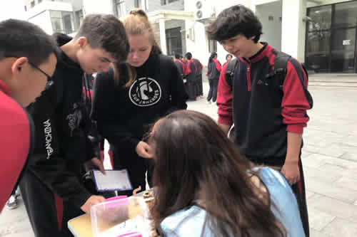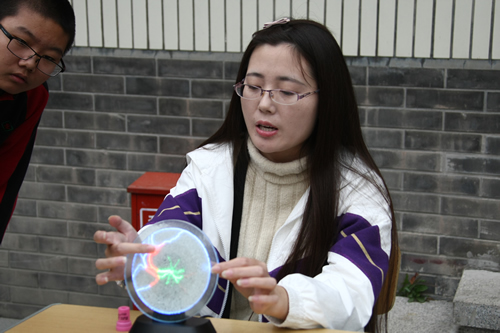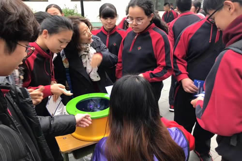 参加完礼堂内的开幕式以后,国际部师生来到综合楼前,开启了异彩纷呈的“科技之旅”——高温超导磁悬浮、温柔的电击、动态窥视无穷、机械手指、无线充电、记忆合金、火线冲击、鱼洗盆、隔空点灯、激光竖琴、跳舞的沙画、机器鱼二代、表情机器人、穿墙而过、悬浮地球仪、磁绷锁、人体电池、高斯加速炮、车轮进动仪、巡线、避障、红外小车。一个接着一个的科技人文节小展位,给大家一种课堂之外焕然一新的神奇体验,留学生们在愉快的体验中感受到了科技的奥秘。
