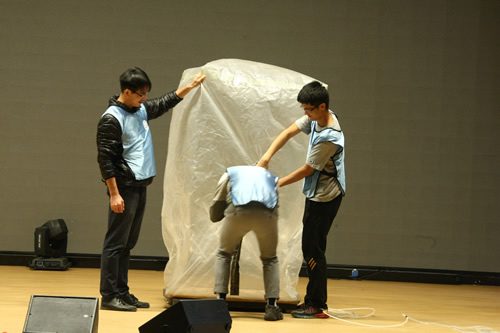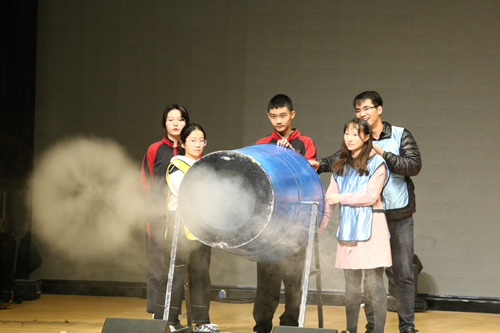 留学生们首先参加了礼堂内举办的开幕式,开幕式由中国科学院的老师亲自主持。学生们首先欣赏了精彩绝伦的机器人开场舞,然后领略了氮气屋神奇的变声效果和壮观的火焰“*”,接着体验了一把人体钢琴的奥妙,最后观看了空气大炮打出几十米远的“煤油圈”的神奇现象。