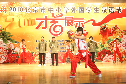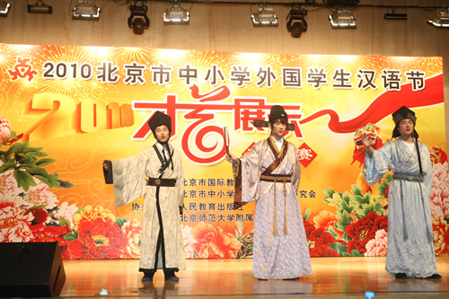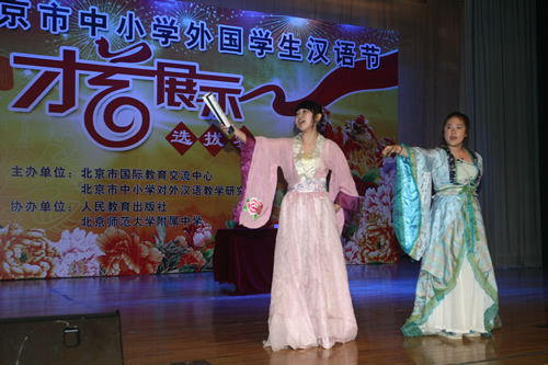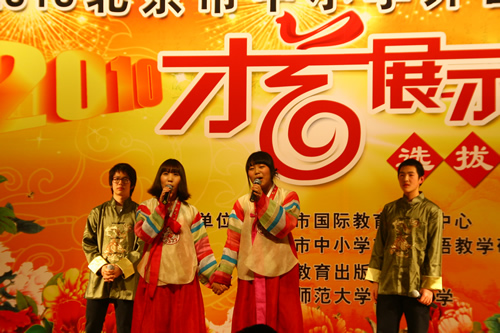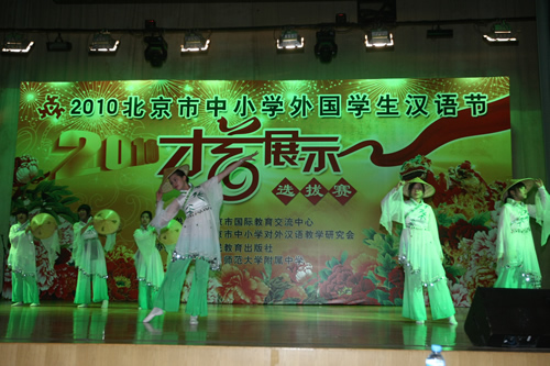 “2010北京市中小学外国学生汉语节才艺展示选拔赛” 于11月16日在我校举行,获得圆满成功。活动由北京市国际教育交流中心和北京市中小学对外汉语教学研究会共同主办,我校和人民教育出版社协办。到会的领导有北京市国际教育交流中心刘仁健部长和北京市中小学对外汉语教学研究会王京秘书长。评委来自人民教育出版社、北京语言大学、北京音乐学院、首都师范大学的5位专家。