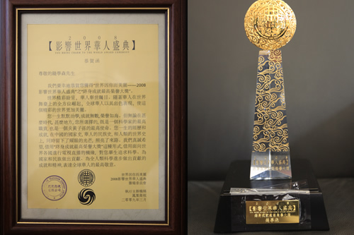 2009年3月28日,由凤凰卫视及凤凰网策划,星洲日报及全球十余家媒体联办的“世界因你而美丽――2008影响世界华人盛典” 在北京大学百年讲堂举行颁奖礼。本届华人盛典为纪念我国建国60周年特别增设“终身成就最高荣誉大奖”,经过百名华语资深媒体人推选,这一特别荣誉授予了著名科学家、中国航天事业奠基人、我校杰出校友钱学森先生。钱夫人蒋英女士代钱老到场领奖,并发表获奖感言:“学森因年迈体弱,不能前来领奖,深感歉意,能为国家和人民做点事是学森一生的追求。得到这么多炎黄子孙的支持和认同,他感到十分欣慰,他让我转告他的愿望,祝愿这个活动鞭策更多的中华儿女,为祖国贡献出力量,使我们这个世界更加美好!” 全国政协副主席董建华先生为钱学森院士颁奖。