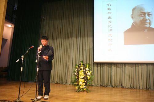庄严的升旗仪式之后,全校师生为钱学森校友默哀一分钟。刘沪校长代表学校向全校师生介绍了钱学森校友生平,深情回顾了钱老及其家人与附中的联系,表达了全校师生对国家痛失栋梁的哀痛之情。他号召全校同学以钱学森为榜样,树立爱国大志,全面发展,以实际行动纪念钱学森学长。学生代表高二10班冯子航同学发言,表示要以钱学森学长为榜样,努力成才,报效祖国。集会后同学们纷纷在巨型条幅上写下对老学长的无比崇敬与无限哀思。随后同学们来到校园内的钱学森铜像前献上鲜花,并参观学校刚刚落成的钱学森展览馆,深情缅怀这位对国家民族做出了巨大贡献的杰出学长。