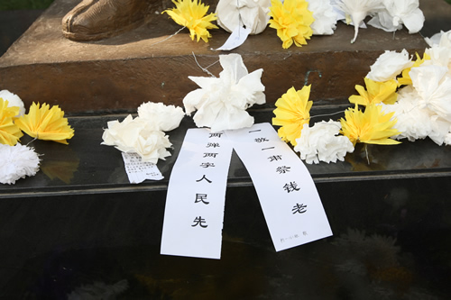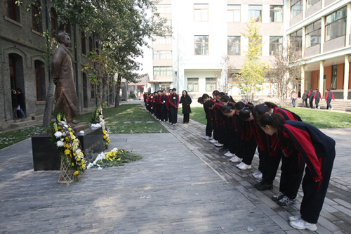 巨星陨落,举国痛惜。我校师生自发组织各种悼念活动,11月3日,初一年级同学们收看了关于钱老生平的纪录片。 钱老高尚的爱国主义精神,积极创新的精神和自强不息几十年如一日默默奉献的精神,深深触动了同学们。同学们将自己亲手制作的朵朵白花满怀深情摆放在钱学森雕像前,祭奠前辈,表达无比崇敬和无限哀思。随后同学们参观了钱学森纪念馆,缅怀为我们留下了无数精神财富的老校友,同学们表示要以钱学森学长为榜样,努力成才,报效祖国。