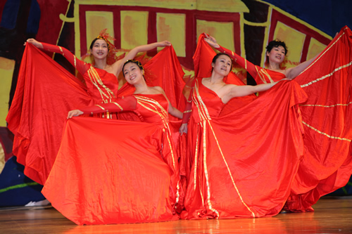 身穿红裙体态婀娜精神饱满的附中女教师们以舞蹈《我爱你中国》为晚会拉开了华丽大幕!