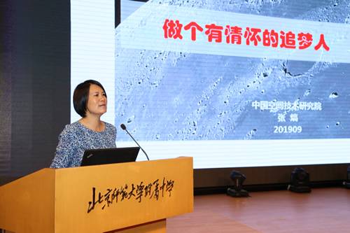 嫦娥四号探测器项目执行总监、附中89届校友张熇研究员以“做个有情怀的追梦人”为主题与学弟学妹分享了她的故事。她从80年代在附中的生活谈起,深情回忆六年附中生活为她开启的自由探索之路。她深入浅出地向同学们介绍了她所亲历的“探月工程五战五捷”的巨大成功,为附中的同学们展现了我国航天事业的巨大进步和国际影响力,以及这背后全体航天人艰苦奋斗的精神。她寄语学弟学妹“做有梦想的人,做拥有强健体魄的人,做脚踏实地的人。因为“所有伟大的事业都始于梦想、基于创新、成于实干”。