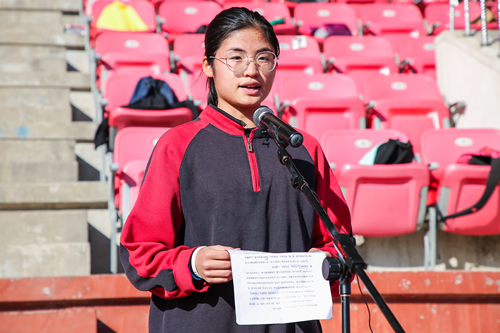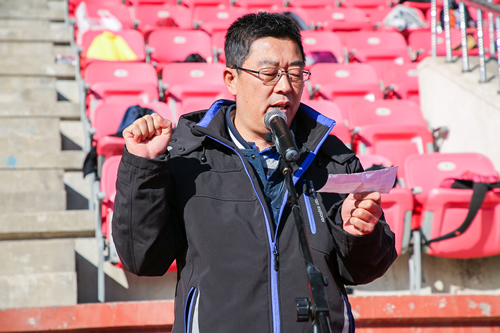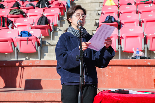 在庄严的升旗仪式结束后,王莉萍校长为运动会致开幕词,她以中国女排的事迹鼓励运动员们敢于拼搏、勇于进取、赛出风格、赛出水平。随后裁判代表胡建东老师、运动员代表郑彤同学分别宣誓后,运动会正式开始。