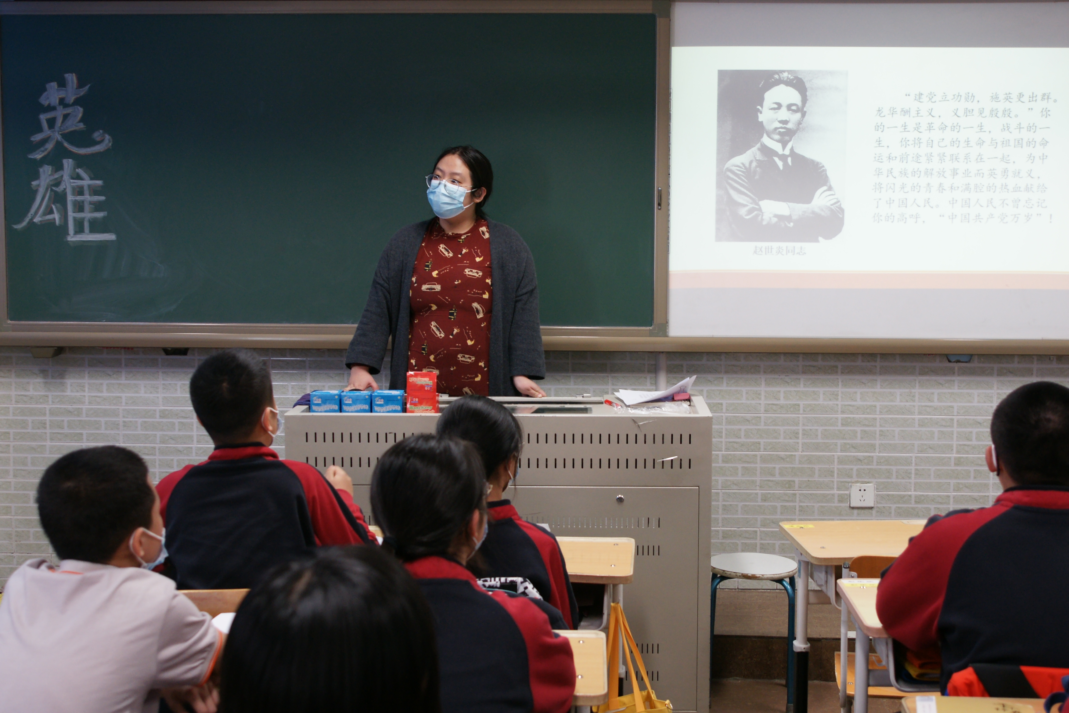 上学期,初一年级组织同学们观看纪念抗美援朝70周年大型纪录片《英雄儿女》,本学期又结合清明开展《崇尚英雄》主题班会、瞻仰祭扫赵世炎烈士像,点燃孩子们心中的英雄情怀;语文备课组结合教材内容,围绕“群星闪耀”“家国情怀”等主题开展教学,用一篇篇优美的文字带领同学们走进英模人物的精神世界;结合观看“感动中国2020年度人物颁奖盛典”,语文课布置了一项特殊的作业――仿照感动中国颁奖辞写下给心中英雄的致敬词。毛泽东、周恩来、赵世炎、钱学森、邓稼先、袁隆平、屠呦呦、钟南山、张定宇…….革命英雄、科研英雄、抗疫英雄、戍边英雄,大家纷纷提笔,写下对英雄人物的敬仰和追随。那些为国家民族的独立富强、为人民生活的安定幸福做出过巨大牺牲和贡献的人,成为了同学们心中最亮的“星”。
