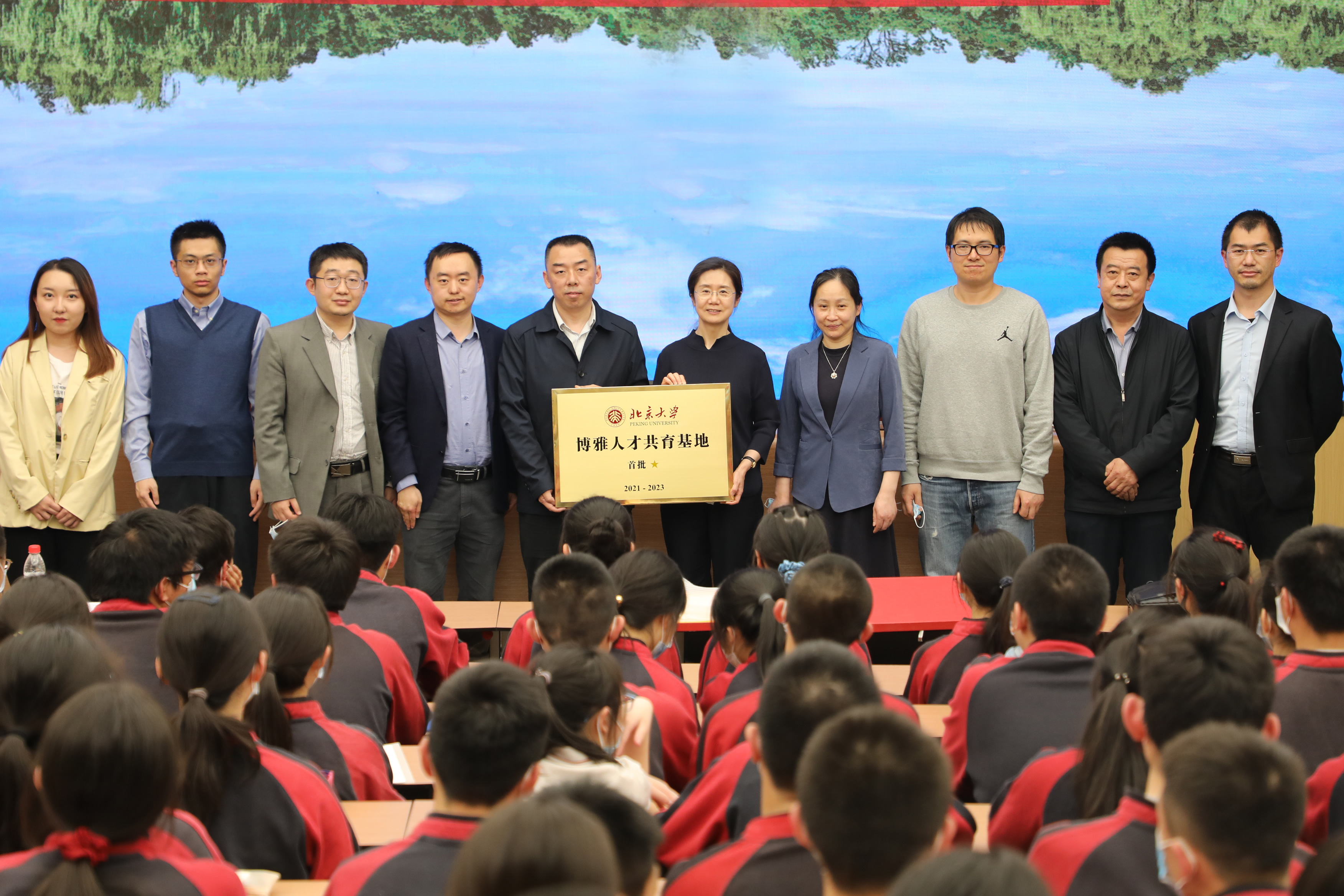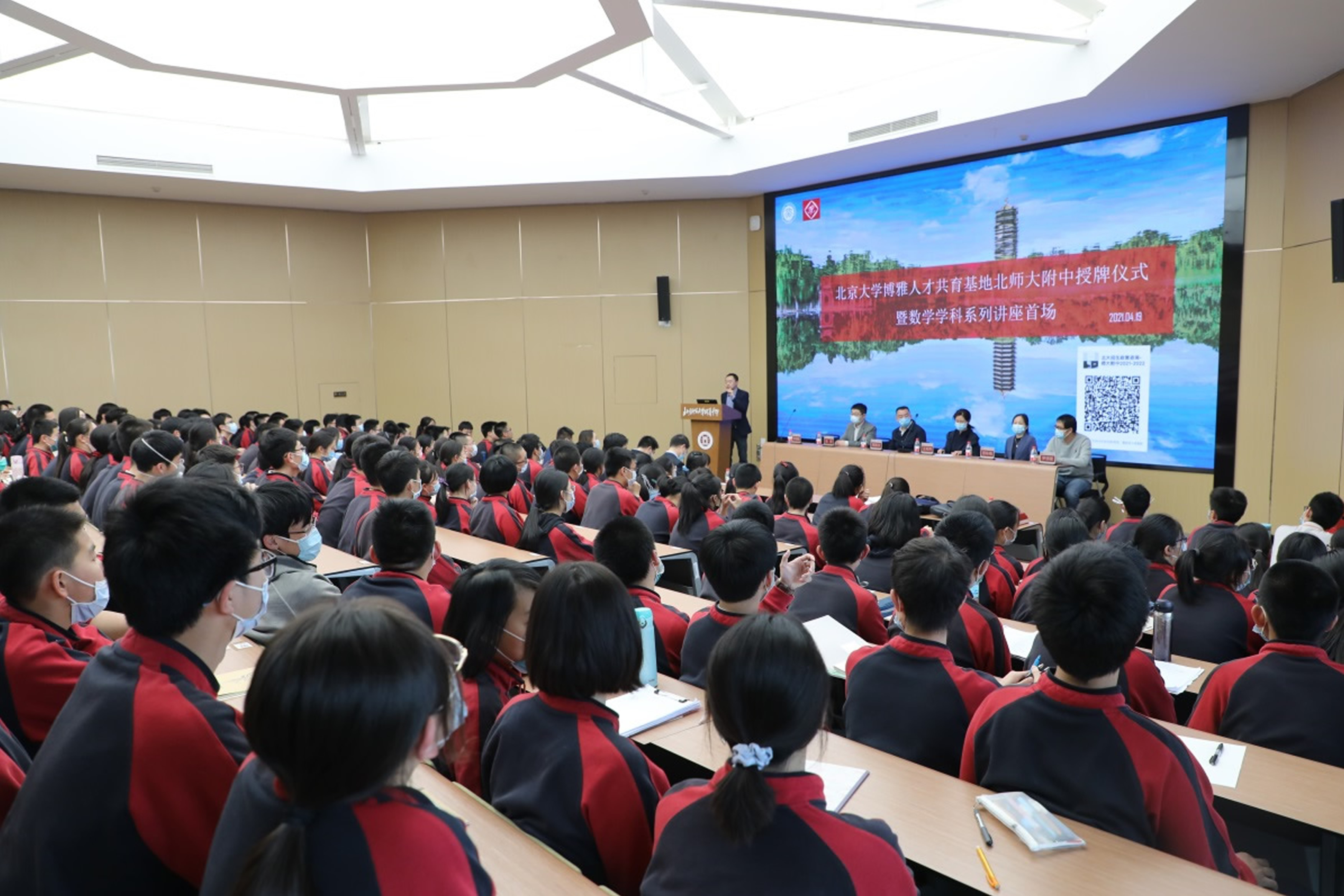 4月19日下午,北京大学首批“博雅人才共育基地”授牌仪式及首场博雅学科讲座在我校南阶梯礼堂隆重举行。北京大学北京招生组周昌令副组长、李晓鹏老师、北京大学数学科学学院张原研究员;我校王莉萍校长、顾咏梅副校长、课程处许洪发主任、数学教研组长罗德建老师、学科组长毛玉忠老师,北大本科生、校友代表,我校钱学森班师生代表和学科优秀生代表等出席。