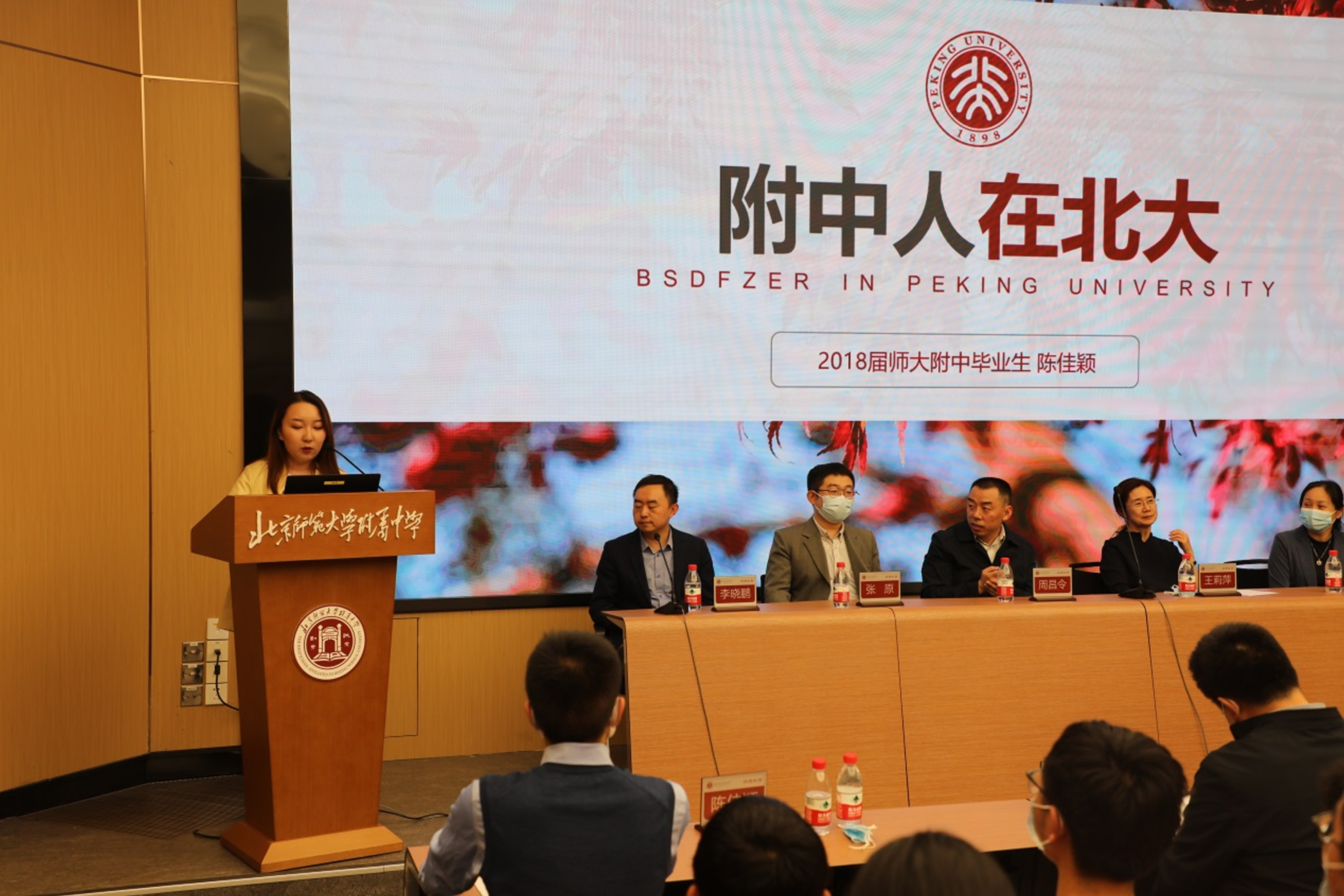 授牌仪式由北京大学李晓鹏老师主持,李老师回顾附中历史上的诸多辉煌,鼓励学弟学妹们以前辈校友为榜样,志存高远、努力学习,再创辉煌。李老师也回忆了自己在附中的学习生活点滴,感恩母校,真情流露。