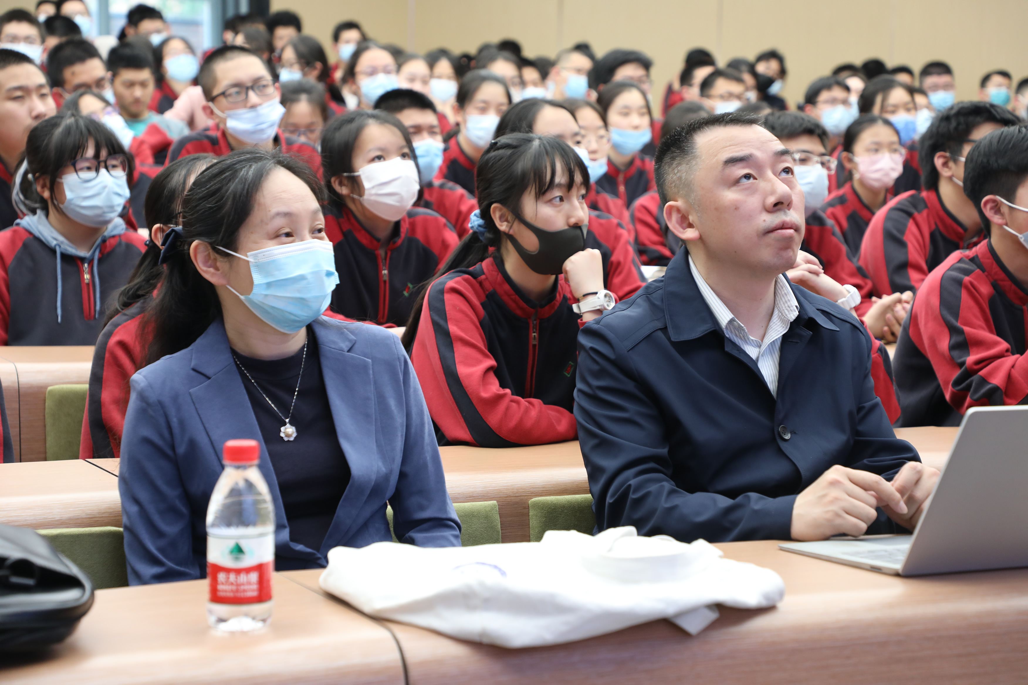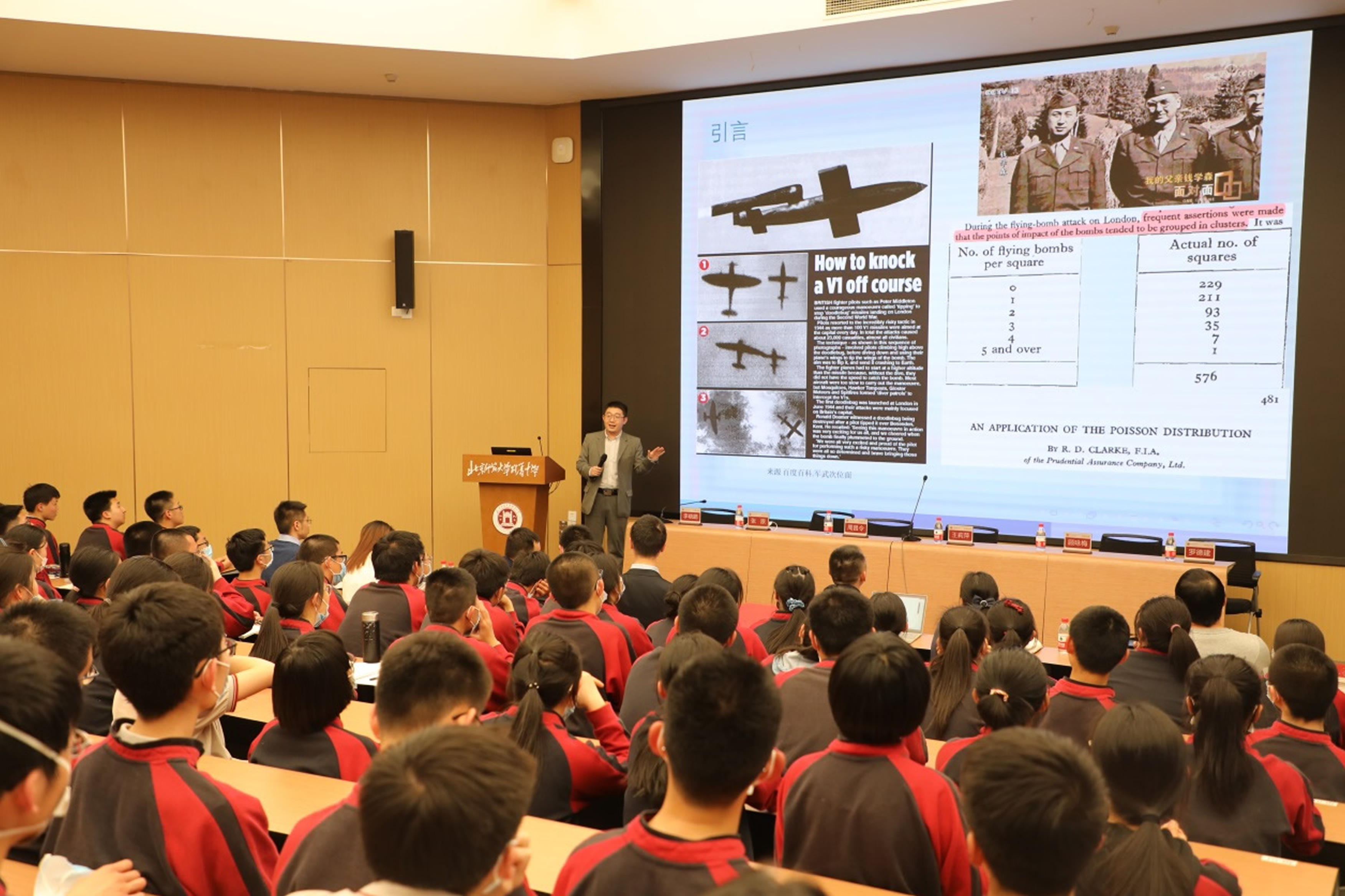 授牌仪式后,北京大学张原老师为我校钱学森班的同学们做了题为《盲盒,盖革计数器和反法西斯战争―从泊松分布谈起》的博雅学科讲座,鼓励同学们报考北大数院。整场讲座生动有趣、引人入胜,深刻地展示了数学的魅力。