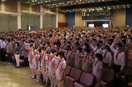 “建团”单元,由视频“我和祖国共成长”开启,共同回顾了同学们从出生到2021年的今天,展示了同学们和共和国的飞速发展同频同步、同心同向的成长历程。校团委书记张明瑶宣布了初二年级48名新团员的名单,同学们在团旗下举起右手庄严宣誓,又有48名附中青年成为光荣的中国共产主义青年团团员。
