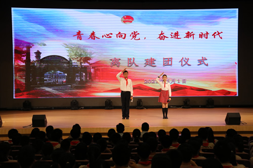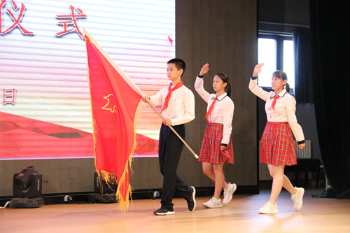 仪式以“青春心向党,奋进新时代”为主题,将“向时代报道”作为主线贯穿于“离队”和“建团”两个单元。离队单元,通过“我和红领巾的回忆”微视频与同学们共同回顾了他们与红领巾相伴的8年时光,同学们最后一次用洪亮的声音庄严地在队旗下呼喊“时刻准备着”,最后一次高唱“我们是共产主义接班人”队歌,最后一次目送队旗离开,最后把胸前的红领巾收藏在信封之中。