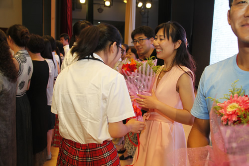 伴随着《感恩的心》,同学们纷纷上台向辛勤培育他们的老师鞠躬致谢并送上了芬芳的鲜花,以此寄托对恩师教诲的感恩之心。