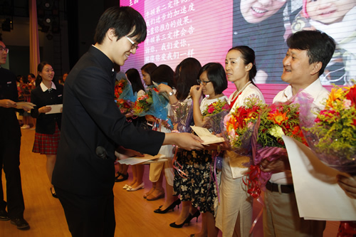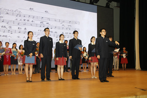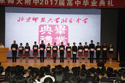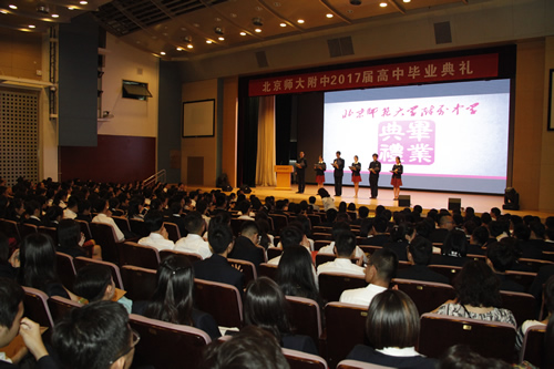 王莉萍校长介绍了我校特级教师胡朗老师的几次选择,并嘱咐同学们做好人生的选择。她说人生的道路千万条,不论你选择哪一条,沿途都美丽的风光,但同时也会有岔道和沼泽地,关键在于人生的态度和生命的精神。 最后十四位班主任老师和年级组长张成斌老师登上舞台,深情朗诵诗歌《遇见附中,遇见你》,回顾了三年的点点滴滴,号召毕业学生不要拘泥于离别的伤感,而是从今起肩负起社会责任、更具家国情怀,“慢慢走出小我,成就一个大大的我”。 伴随着校歌的旋律,附中2017届的365名高中毕业生结束了他们的高中生活,满载着母校的爱与希望,开启了一段新的征程。