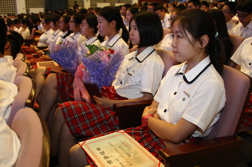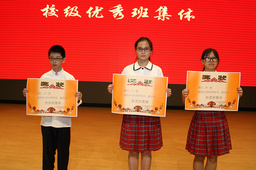 升国旗并奏唱庄严的国歌后,顾咏梅副校长宣读了初三毕业生名单,全年级同学依次上台,王莉萍校长为他们亲手颁发了毕业证书。那一刻的欢欣与感动深深铭刻在所有人的心中,许多到场家长为孩子毕业瞬间拍照留念。紧接着,梁原草副校长宣布了各项获奖名单,校领导们为表现优异的个人和集体颁奖。这是对于他们三年来努力学习、认真做事的肯定,所有获奖同学们都为来自母校的表彰而深深自豪着。
