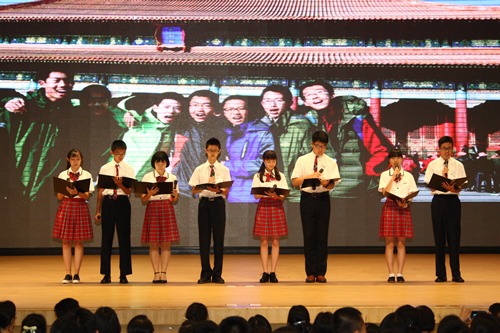 之后,初三年级的同学们用一组节目传递了不舍、憧憬与感恩。初三9班的瞿欣畅同学作为学生代表发言,带领同学们回顾了难舍的附中三年生活;初三1班王昊峰等四位同学演唱歌曲《蓝莲花》,表达了初三全体同学们对于理想未来的期盼与执着追求;而来自初三年级各班级的八位同学深情朗诵自创诗歌《三年》,表达了同学们对老师、家长、同窗、母校的感恩之情。