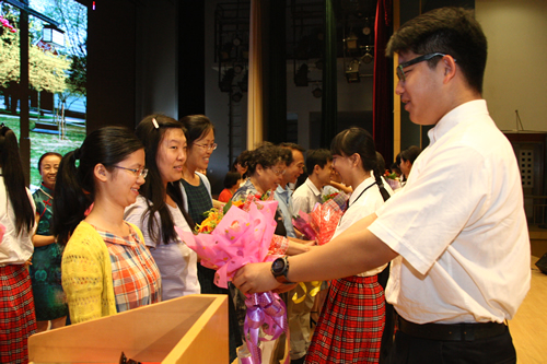 物理组王彬老师代表全体教师进行发言,祝愿同学们不忘初心,带着附中“诚爱勤勇”的精神奋力前行。最后,同学们涌上台前向敬爱的校领导和老师们献上鲜花,表达附中学子对母校这三年来的辛勤培育的感激之情。师生相拥,合影留念,大家纷纷热泪盈眶。
