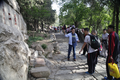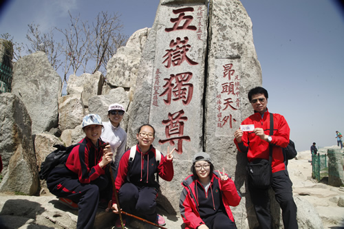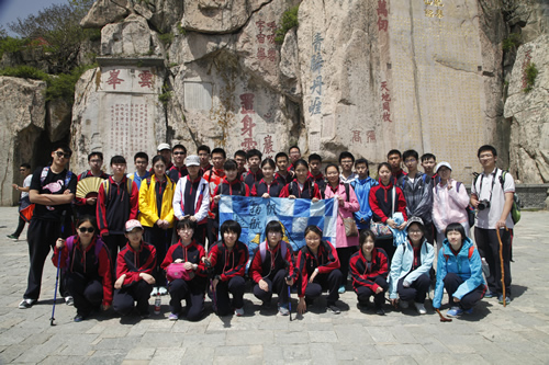 次日早晨,同学们已在泰山之下整装待发,准备开始此行的重头戏。天气晴好,伴着凉爽的风,我们从红门出发,在攀爬了2公里以后,同学们都感觉腿根又酸又麻,抬头遥望远方,还是坚持挺了下来,不甘示弱,不坐缆车。经过了中天门、南天门,我们在攀爬了近六个小时后,终于全体登上了玉皇顶。随着高度的变化,眼下的风光也愈加不同。泰山之巅,俯瞰山河,我们一起体味“一览众山小”的豪情,升华对于人生价值的认识。