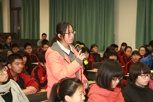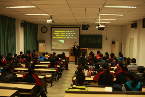 2014年12月19日,我校“学生干部培训营”第二次学长论坛活动在北阶梯教室进行。我校优秀校友,北京大学毕业生冯宇辰学长对学生干部代表做了题为“未来10年的对话”的主题演讲。 冯宇辰是我校2006级毕业生,当年他以优异的成绩考入北京大学外交学院,毕业后投身于校外教育事业,创办北京嘉朋汉坊教育咨询有限公司。他在演讲中,根据他这几年来的教育培训经验,告诉同学们新时代的学生需要拥有哪些实力才能在未来的竞争中成为优秀人才。在活动中,同学们积极和学长互动,时而若有所思。冯宇辰学长以他的亲身经历和生动风趣的语言告诫同学们要敢于冲破障碍,鼓起勇气实现自己的梦想。冯学长还为同学讲述了他自己总结的现代青年领导力,以及我们作为一个新时代国际公民所应该具有的硬实力和软实力。最后,同学们踊跃向学长提问,教室里变成了一片欢乐而充满智慧的海洋。