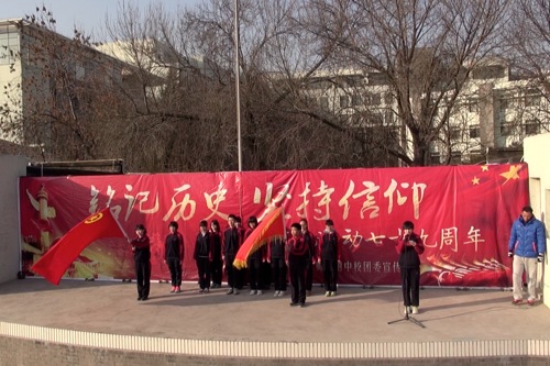 12月8日早晨,校团委利用升旗仪式时间,组织全校师生庄严纪念“一二.九”运动七十九周年。校团委副书记王鹿玄同学做了慷慨激昂的国旗下演讲,带领同学们一同回顾了一二九运动的历史,呼吁每位同学坚定信仰,团结起来,共同实现理想。校团委全体委员、初一少先队代表在国旗、团旗和队旗下郑重宣誓,铭记历史,不忘使命。
