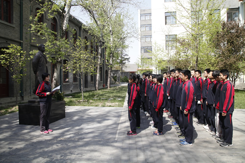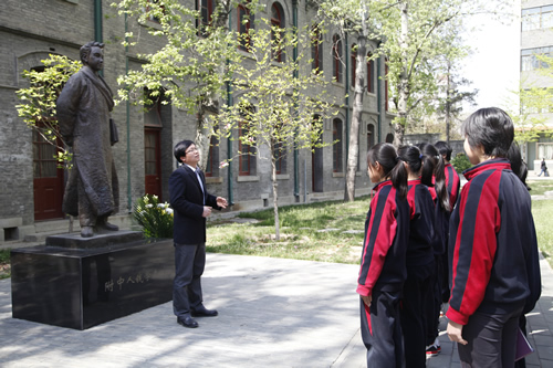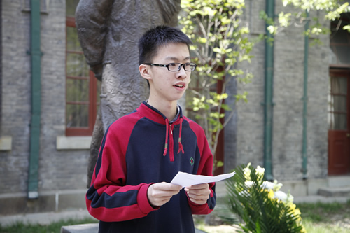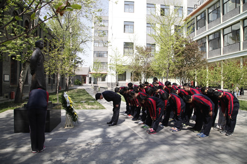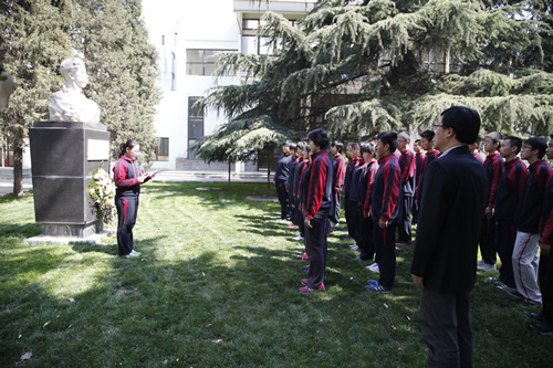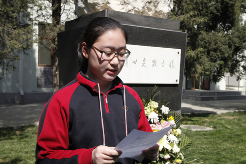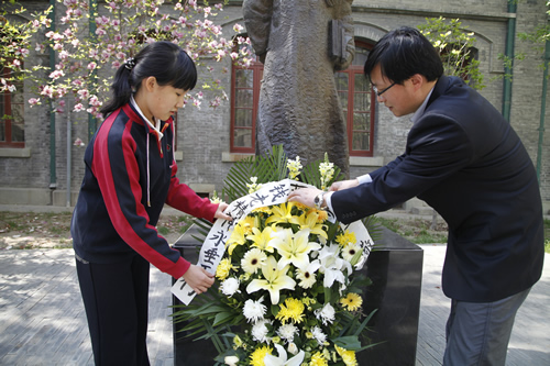 2014年4月4日中午1时许,我校高一钱学森班代表全校师生,在清明节来临之际,向矗立在校园内的钱学森铜像和赵世炎烈士像敬献花篮,祭奠校友,寄托哀思。