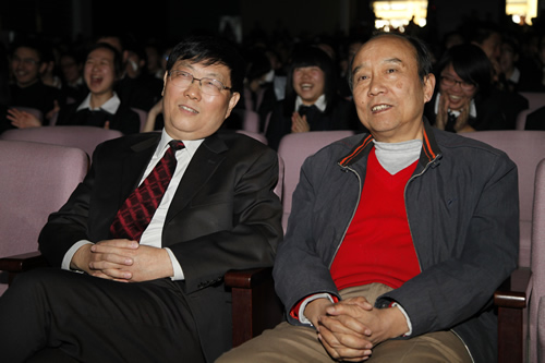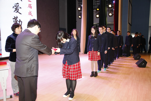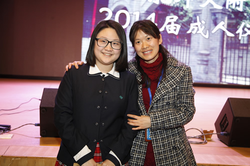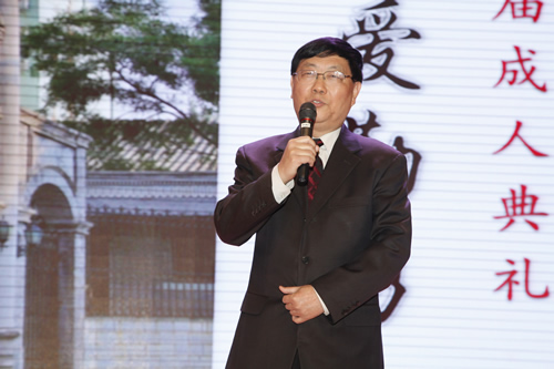 大屏幕上播放老师们十八岁的照片时,会场里不断地响起欢呼声和掌声。同学们在和老师一起追忆似水流年时,体会到了岁月对人生的雕琢与洗礼,更加深刻地认识到了成长的意义。看着老师们的亲切寄语和祝福,想起平时老师们的付出与关爱,同学们明白了一个道理:岁月可以带走青春,却带不走才华和信仰。刘沪校长代表学校和全体高三老师上台致辞,并讲述了自己冲刺高考的亲身经历,来激励高三的同学们在最后的70多天里奋力拼搏,为母校再创佳绩。附中还为每位同学准备了一份成人礼物——成人纪念章。上面镌刻的校训“诚爱勤勇”四个大字代表了附中对同学们的祝福与期望。
