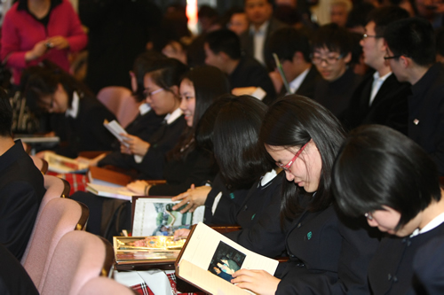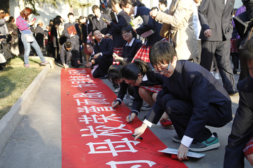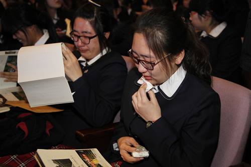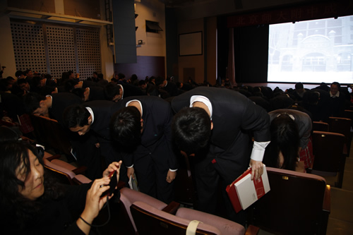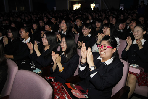 仪式在婴儿啼哭声中拉开序幕。大屏幕上连续播放各班同学从小到大与父母亲人的合照,在《时间都去哪儿了》的动人歌声中,同学们纷纷回忆起自己成长的点滴,体会到了岁月的流逝,更重温了父母永不退色的爱。随后,同学们收到了家长们精心准备的成人礼物——个人成长纪念册。在一页一页翻看时,同学们深深明白了,父母的时间都去哪儿了,都在儿女成长的点点滴滴里,同学们流着泪水集体向家长深深鞠躬表达了心底对父母的爱与感激。家长也收到了同学们写的心里话。很多家长边流眼泪边笑着说,这是第一次收到孩子的手写信件,感到很激动。