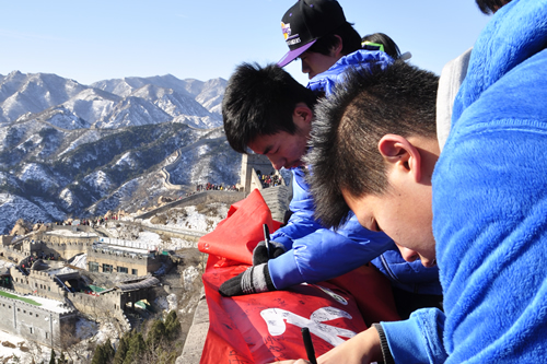 在第三和第四个烽火台中间,自治会的同学准备好了笔和横幅,让路过的同学写上自己的高考誓言并签上姓名,横幅上是这样写的:不到长城非好汉,人不追梦枉少年。高三,是人生中一段难得的经历,这经历他纯粹、劳累、彷徨、美好、崎岖、珍贵......如果你把人生当做一段段过程而非一个个由结果构成的坐标,那么你一定会珍惜这一年你体会的一切。字如其人,在每一个充满个性的笔迹背后都能找到一个鲜活的灵魂,就像这些签名。不论个人的路怎样走,有了决心和目标,总会达到,终有收获,所以这就是这次出行的目的:树立目标,强化决心。