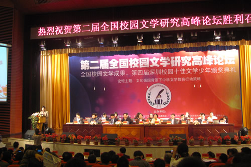 2012年12月1日,由中国教育学会中学语文教学专业委员会、中国当代文学研究会校园文学委员会主办的“第二届全国校园文学研究高峰论坛暨全国校园文学成果展览会”在深圳红岭中学隆重开幕。本次论坛的主题是“文化强国背景下的中学文学教育行动策略”。