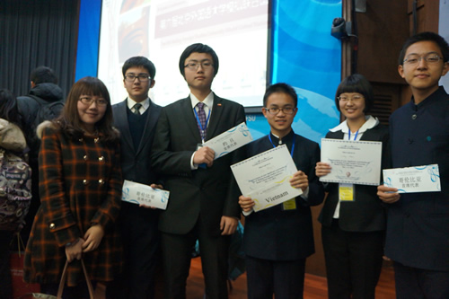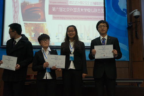 艾笑同学及奚源同学凭借其出色的知识积累和模联能力,获得了大会颁发的最佳学术奖,这也是全场唯一获奖的高中生代表。韦铭杰及王婵同学凭借不逊于大学生的流利英语及出色演讲也赢得了全场代表的掌声和赞叹。艾尼哈尔和张子雄也有突出表现,获得了北外会主席团的一致好评。