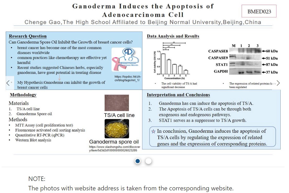 ISEF作为全球级别高水平的中学生科技竞赛,每年有大约700万学生参与,今年最终共有1750名来自全球63个国家及地区的选手入围总决赛,入围率不到万分之三,北京市共有9个学生项目入围。高辰歌同学作为我校金鹏科技团成员,在中国科学院生物物理所陶宁导师的实验室完成了研究课题《Ganoderma Induces the Apoptosis of Cancer Cells》(《灵芝孢子油抑制乳腺癌生长效应研究》)。2021年12月,高辰歌同学在全国英才计划论坛(生物)中脱颖而出,获得优秀学员称号并入选ISEF冬令营。2022年1月,她通过ISEF冬令营的筛选,成功入围第72届ISEF全球总决赛。2022年2月-5月,高辰歌同学进行了充分的参赛准备,补充实验、提交参赛的各项材料、布置线上展板等,最终顺利完成答辩,充分展现了我校高中生的风采和对科学研究的热情。
