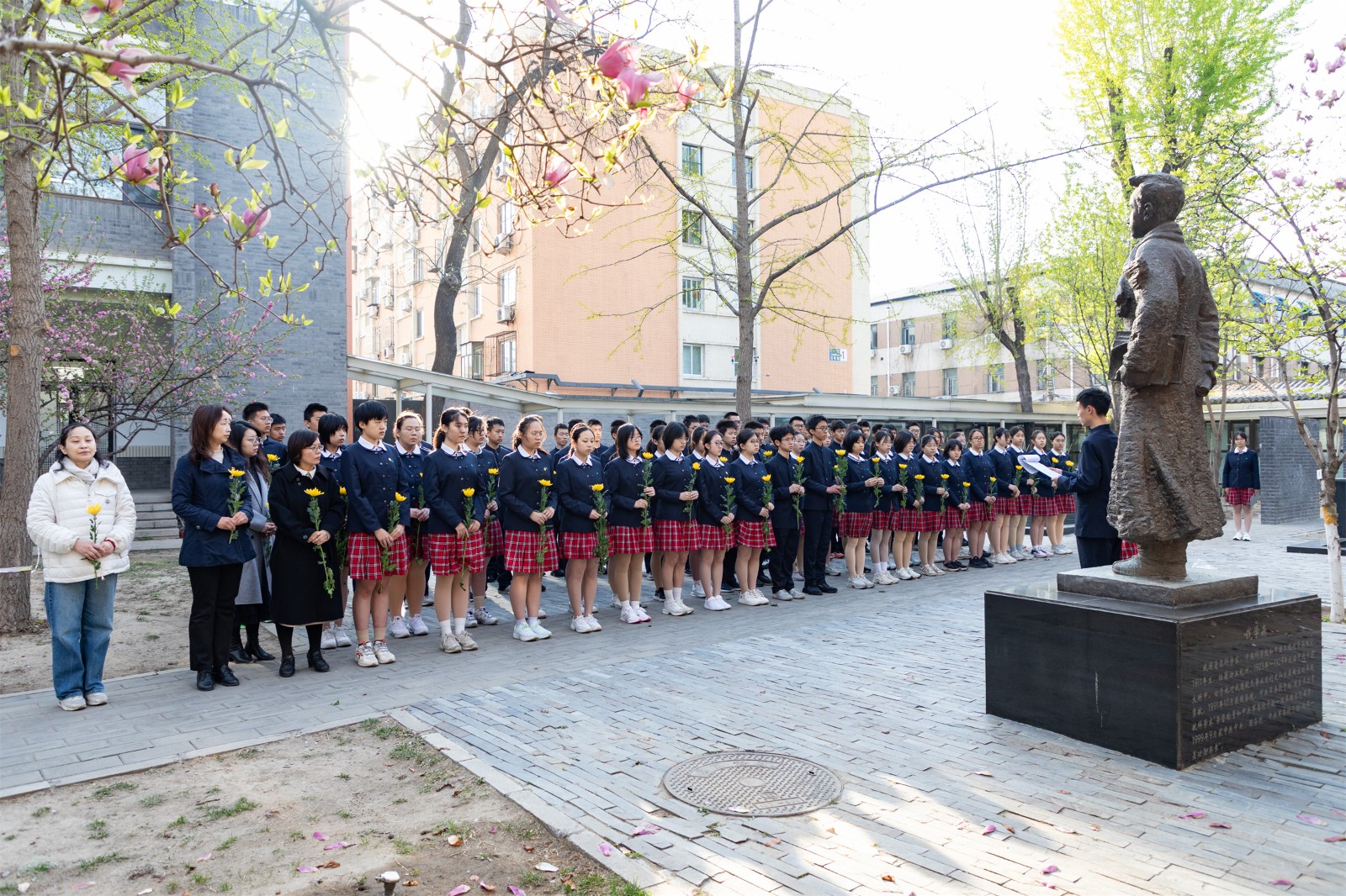 在林砺儒校长塑像前,学生们读到:“巍巍华夏,教泽流芳。今值清明,吾辈踏和平门故地,抚附中黉墙朱瓦,犹见先生奕奕神采跃然其间。忆昔壬戌之岁(1922),先生执掌杏坛之时,京城玉兰香雪满庭。烛影摇红间,一柄竹刀裁却《学制刍议》旧黄卷,墨海翻涛处,"六三三"新章初现雏形。都门耆宿掷鸠杖而诘:"六龄童蒙,三载舞勺,复三年便束发受书?"先生振素袍答曰:"教育者,犹木铎振土培根,待新蕊发于旧枝耳。"遂秉烛修书,寒暑八易,终使新学制如春溪破冰,汇入华夏教改洪流。”