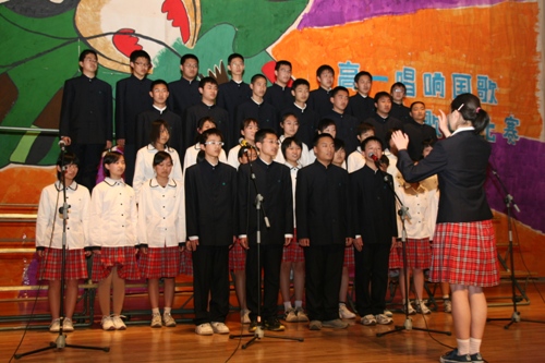 4月3日下午,我校在礼堂举办了“唱响国歌”高一年级歌咏比赛。这次大赛由高一年级组和校团委联合主办,是本届“青杉”艺术节的又一项重大赛事,也是为迎接北京奥运会而开展的一项爱国主义教育活动。比赛要求必须演唱一首国歌或者校歌,另一曲目自定。担任评委的有艺术组齐宏老师、张秀玲老师、陈卓老师以及冯希奇老师。高一9班以精彩的演出获得一等奖;高一6班和11班获二等奖。赛后,齐宏老师做了点评;刘沪校长和王玉清校长为获奖的班级颁发了奖状。