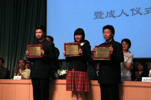 当成人仪式结束的时候,许多同学拥抱在一起,忍着泪水祝愿彼此的明天。台上,陪伴了学生三年的赵敏老师拥着学生们献给她的花束,轻声哭泣。无数强忍的泪水在看到台上赵老师的那一刻崩溃,三年了,时刻萦绕耳边的是老师的谆谆教诲。无法忘记老师在解答问题时庄重的神情,无法忘记老师课堂上微笑的脸,无法忘记泰山和承德之旅的那些并肩走过,无法忘记三个新年一同度过的不眠之夜。今天将要离开,母校的一切却将永远铭刻在每一个人的记忆里,不可磨灭。