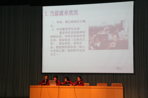 为了使学生树立正确的人才观和积极向上的人生态度,努力使自己成为国家建设的栋梁人才,寒假期间,高二年级的同学进行了“人才市场调查”的社会实践活动。同学们采用了多种形式:有的到附近的人才招聘市场收集一手资料,有的到高等学府向老师询问整体的人才需求形势,还有的在网络上捕捉最新人才市场动态……。3月27日高二年级各班精选出了各自的优秀作品,以演示文稿的形式向全年级学生进行展示汇报。此次活动使学生们走近了社会,更使学生们认识到,当今的人才必须拥有健全的人格,能用坚定的意志、坚忍不拔的毅力以及乐观的态度去面对未来的一切,敢跟强者竞争,会对弱者同情。学生们还认识到在未来的高速发展的信息社会里,要适应经济、社会的发展,建设者们必须是十分善于学习的,是能够接受不断出现的新知识、新事物来提高自己的工作能力的。通过此次活动,每个同学都有了一份属于自己的收获。