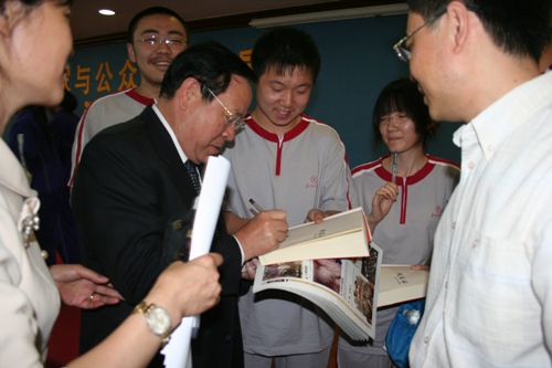 在会上,老科学家们针对我国科普工作的现状及紧迫性,依次发表了精辟的见解。当老科学家们的发言刚刚告一段落,此时会场上发生了一件出乎人们预料的事情,我校学生王英骁举手示意主持人要求发言,主持人临时修改议程,破例同意他发言。王英骁就我国科普工作的发展落落大方地谈出了自己的想法和建议。他讲到,现在许多中学生都在追星,那是因为现在的媒体中到处都充斥着这方面的信息,而要追求科学知识或科学家的故事却很难寻。希望我国的各个部门能够注意到这点,充分利用现代传播媒介来拓宽青少年获取科学知识的途径,像于丹可以在百家讲堂中把论语讲给大众,科普宣传也应该利用这些传统的平面和电视媒体平台来宣传科普知识。另外,希望像清华大学等一些高等学府能开放自己的实验室,让高中生在中学时代就能开展自己的研究,培养科学的兴趣。还可以将科学家们的讲座、报告做成光盘,利用互联网的快捷方便优势等许多途径广泛传播科学知识、科学家的故事,使大众有更多的途径了解科学知识,使青少年从盲目追星中摆脱出来,从而热爱科学、尊重科学,提高全民族的科学素养。……。他还讲到,在寒假中他曾给比尔?盖茨写过一封信,比尔?盖茨及时地回了信,希望他能珍惜高中和大学的各种科学手段学习最多的知识。比尔?盖茨的回信给了他极大的鼓舞,也使他更加热爱学习,如果我们的科学家也能这样,与我国广大的青少年之间建立一条通畅的纽带,使青少年能够与科学家之间保持密切的联系,那对于我国科学技术的发展将是非常重要的。他的发言得到了与会人员的热烈掌声,给各位科学家和与会记者留下深刻印象。