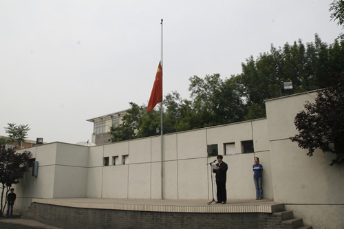 5月19日上午十点零五分,全体师生怀着沉重的心情在操场集会,下半旗哀悼在四川发生的特大地震中遇难的同胞。