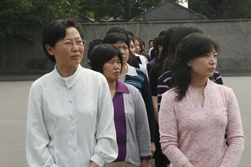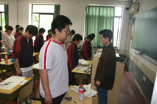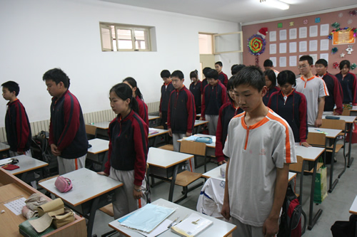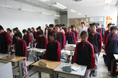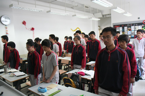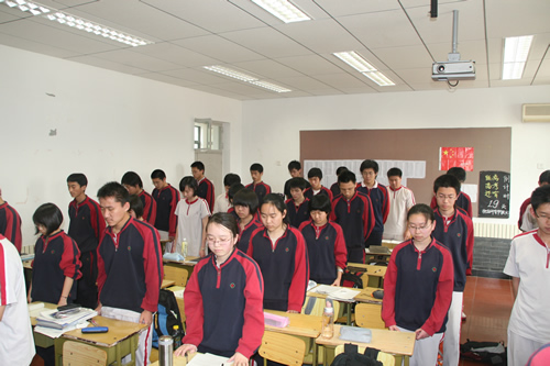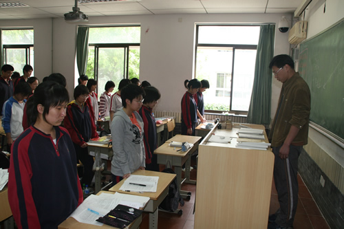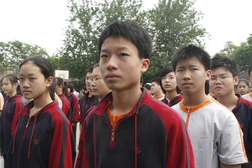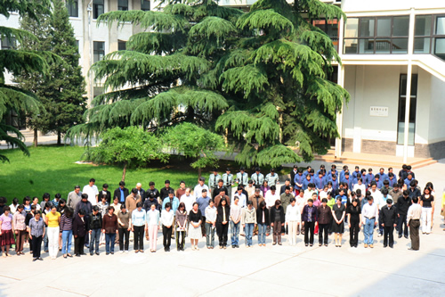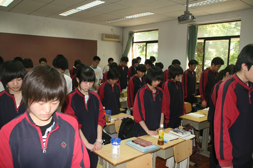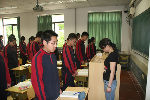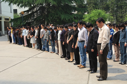 下午十四点二十八分,全校学生、教职员工在教室和赵世炎烈士像前默哀,祭奠在这次灾难中遇难的人们。