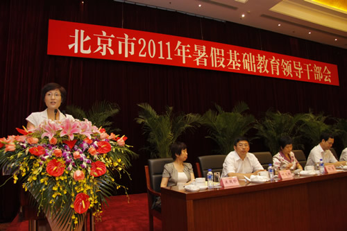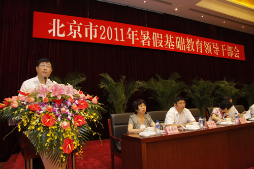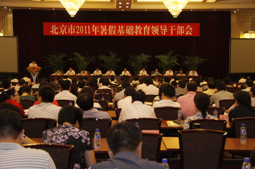 北京市2011年暑假基础教育领导干部会7月14日在北京会议中心召开。市委常委、教育工委书记赵凤桐,副市长洪峰出席并讲话。海淀区副区长付首清、东城区教委主任冯洪荣、我校刘沪校长和朝阳区呼家楼中心小学马骏校长在大会上发言。市教委主任姜沛民主持大会。全市及各区县、大学基础教育方面的领导、中小学校长代表出席了会议。