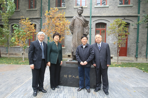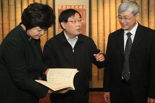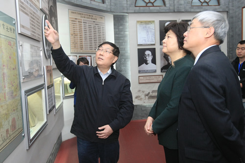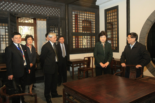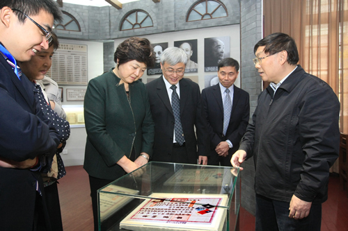 开幕式后,上海交通大学党委书记马德秀,钱学森图书馆建设总指挥吴旦副校长,党委常委李建强和钱永刚教授等一行14人来到我校访问。刘沪校长陪同马德秀书记等参观了我校的中国古代文化研修室(杏坛)、鲁迅文学研修室(三味书屋)、钱学森纪念馆和林砺儒铜像。